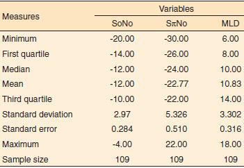 Os padrões de normalidade disponíveis para o MLD são referentes a estudos internacionais ou a estudos pilotos nacionais, com um número restrito de participantes. Dados da literatura internacional indicam valores maiores ou iguais a 10 dB como sugestivos de normalidade11.