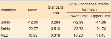 Assumindo que as observações para cada uma das amostras (correspondentes às variáveis aleatórias SoNo, SπNo e MLD) foram idênticas e independentemente distribuídas, porém provenientes de uma distribuição desconhecida, com média µ e erro padrão e, considerando, também, o fato de que o tamanho das amostras foi suficientemente grande (no caso, n=109>30), foram construídos os intervalos de confiança para as médias amostrais, aplicando-se o teorema central do limite. Sob essas condições, a forma da distribuição das amostras foi aproximadamente normal. Assim, neste trabalho, foram estabelecidos valores de referência a partir da estimativa por intervalo.