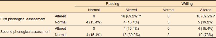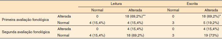 Quando comparamos o desempenho das crianças na prova de escrita com a primeira avaliação fonológica pregressa, observamos, também, que as mesmas crianças que apresentaram distúrbio fonológico apesentaram alteração na escrita (p=0,022), demonstrando grande relação entre o distúrbio fonológico pregresso e a dificuldade na aquisição da escrita. Em contrapartida, não houve diferença significativa entre o resultado da avaliação de escrita e a avaliação fonológica atual (Tabela 1).