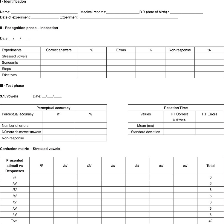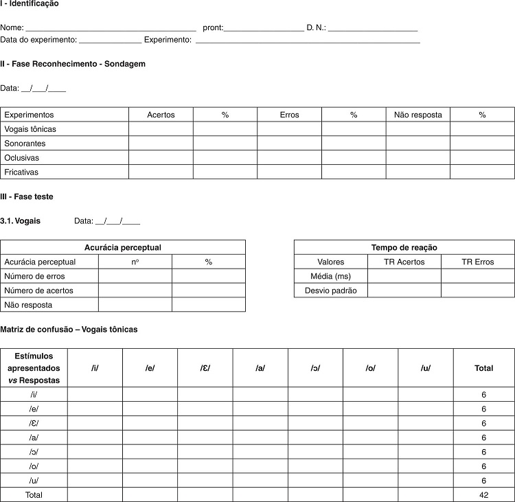 No protocolo de registros do PERCEFAL, as informações sobre o desempenho perceptivo-auditivo na identificação de contrastes fônicos são registradas em função de cada experimento: PERCivogais, PERCocl; PERCifric e PERCison.