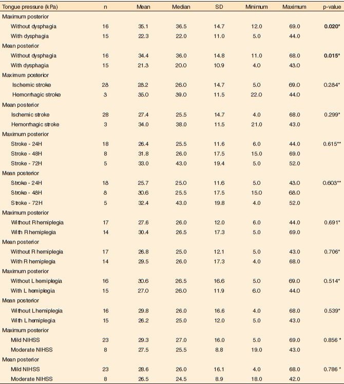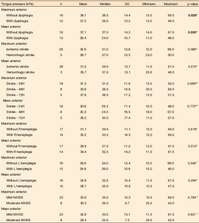Results: Only the presence of dysphagia was associated with tongue pressure. Post-stroke patients with dysphagia had lower anterior and posterior tongue pressure (mean and maximum) than those without dysphagia. The time of occurrence, type, and affected hemisphere of the stroke and severity of the neurological deficit were not associated with tongue pressure. Regarding the degree of dysphagia, of the 15 participants who had swallowing difficulties, 14 were classified with mild and one with moderate dysphagia.
