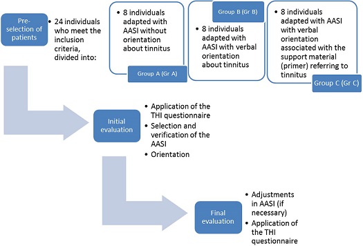 Na etapa da avaliação inicial, todos os participantes receberam orientações em relação à perda auditiva e ao uso do AASI. Associadas a elas, os grupos B e C, vivenciaram formas distintas de orientação referente ao zumbido. Já na etapa da avaliação final, o grupo A também recebeu essa orientação.