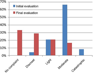 O grau de incômodo do zumbido mensurado pelo THI, no momento da a avaliação inicial e após a intervenção, na avaliação final, está apresentado na Figura 2.