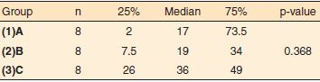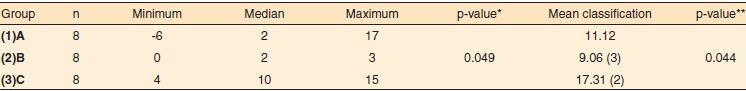 As diferentes formas de orientação trouxeram benefícios na intervenção aos indivíduos da amostra. O escore do questionário THI total, após avaliação final, apresentou dados que indicam que os grupos que foram adaptados com AASI e receberam diferentes abordagens de orientação (grupos B e C) apresentaram resultados mais satisfatórios, em relação ao grupo A, em que houve apenas a adaptação do AASI, sendo que o grupo B apresentou mediana 19 e o grupo C, mediana 36 (Tabela 1). Estes resultados concordam com um estudo(15) que verificou que 74% dos participantes da pesquisa referiram o tratamento utilizando AASI associado à orientação como sendo muito efetivo.