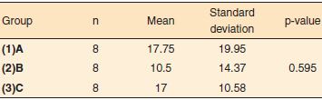 Quanto ao domínio “catastrófico”, os grupos B e C (médias 9 e 9,25, respectivamente) também apresentaram resultados mais satisfatórios do que o grupo A (média 5), durante a comparação da diferença de incômodo entre a avaliação inicial e final, mesmo que tais valores não tenham sido significativos (Tabela 3). Entretanto, não foram encontrados estudos na literatura que tenham avaliado especificamente o domínio “catastrófico”, não sendo possível fazer comparativo com o presente estudo.