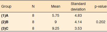 O domínio “funcional” do THI avalia aspectos funcionais do zumbido, tais como mental, social/ocupacional e de funcionamento físico(28). Neste estudo, após comparação entre avaliação inicial e avaliação final, observou-se que não houve diferença entre os grupos (Tabela 2), sendo encontradas as médias 17,75, 10,5 e 17 para os grupos A, B e C, respectivamente. Na literatura atual, são encontrados apenas dados que avaliam o THI em seu escore total, não sendo possível, desta forma, realizar uma comparação entre estudos.