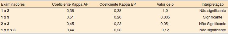 A concordância interexaminadores foi verificada e uma classificação final para a nasalidade foi estabelecida para cada indivíduo, em cada uma das amostras AP e BP. A classificação final correspondeu ao julgamento da maioria. Nos casos em que os três examinadores atribuíram escore diferente a uma mesma amostra, foi utilizada a classificação atribuída pelo examinador com maior coeficiente de concordância intraexaminador, de acordo com o coeficiente de Kappa(25).