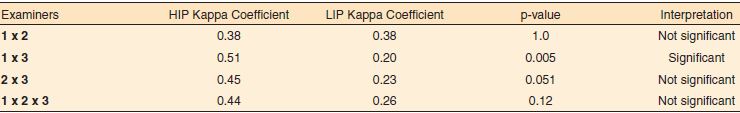 Quanto aos coeficientes interexaminadores, foram observados valores menores, especialmente na classificação da amostra BP, fazendo com que a concordância variasse de pobre a discreta. Para a amostra AP, os coeficientes foram um pouco maiores, gerando variação da concordância discreta a moderada. Um dos fatores que pode explicar a maior concordância interexaminador na amostra AP está relacionado à característica dos sons utilizados. Em consoantes de alta pressão, o ouvinte treinado pode ter maior facilidade em perceber a diferença na emissão, na presença da disfunção velofaríngea, uma vez que a produção da fala ocorrerá de maneira bem diferente da habitual, o que torna mais fácil a identificação da hipernasalidade pelos examinadores. Outro fator causal relaciona-se ao maior uso de consoantes de alta pressão nas amostras de fala de protocolos de avaliações de serviços de tratamento de fissuras labiopalatinas. Há ainda que se considerar, por último, a influência das articulações compensatórias sobre o julgamento da nasalidade, uma variável não controlada no presente estudo.