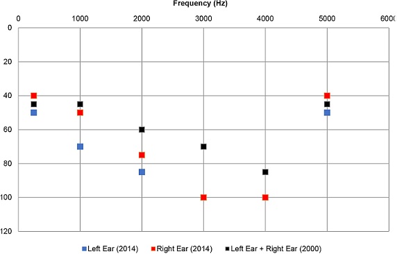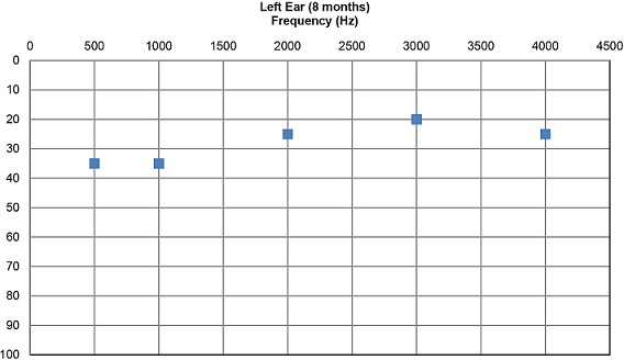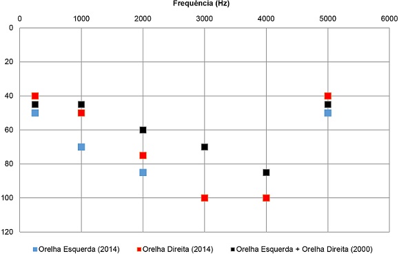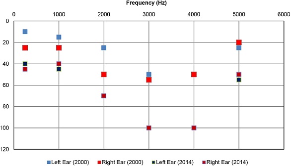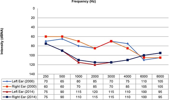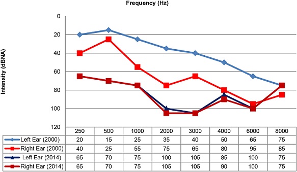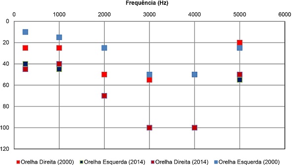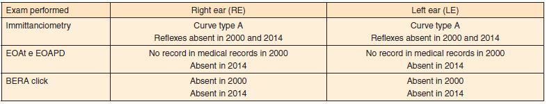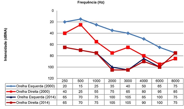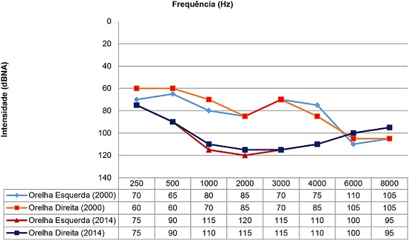 Em 2000, após a realização dos exames, os profissionais puderam diagnosticar a perda auditiva como neurossensorial (PANS) severa bilateral e, assim, adaptar o aparelho de amplificação sonora individual (AASI) e realizar os respectivos testes de validação e verificação. Porém, em 2014, constatou-se progressão significativa do grau de perda auditiva, que passou a ser de grau profundo bilateral, sendo necessário substituir o AASI por outro, de tecnologia superior e mais recente, assim como refazer os testes de verificação (Figura 2).