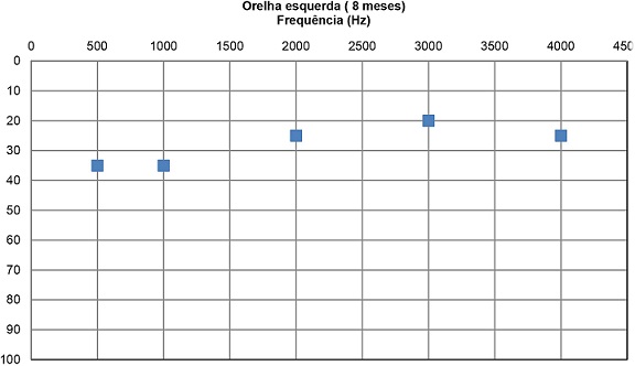 Na orelha esquerda (OE), a pontuação encontrada foi: detecção dos sons do teste de Ling para /a/, /i/, /u/ e /m/ = 100% e para /s/ e /∫/ = 0%; discriminação do nome = 90%; discriminação da questão/afirmação = 0%; identificação da extensão vocabular = 28%; identificação da extensão das sentenças = 30% e identificação das sentenças = 0%.