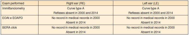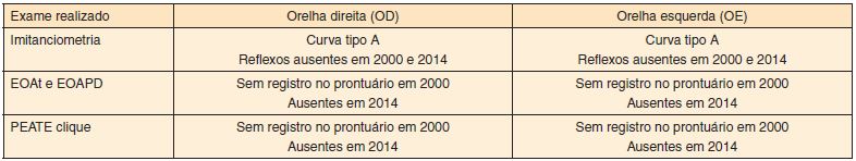 Em relação aos exames audiológicos, foram analisados os exames objetivos, como imitanciometria, emissões otoacústicas transientes e por produto de distorção (EOA t e D.P) e potencial evocado auditivo de tronco encefálico (PEATE), e exames subjetivos, como audiometria tonal limiar (ATL) e testes de percepção de fala (TPF) (Quadro 1).