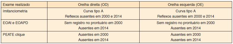 Apesar da progressão da perda auditiva, a gemelar 1 possuía bom vocabulário e linguagem oral, visto que a perda auditiva era pós-lingual. Não constava no prontuário a realização de exames específicos de linguagem. Acredita-se que o motivo seja o fato de a paciente já estar na fase da adolescência em 2000 e, posteriormente, na fase adulta, em 2014, não existindo protocolos específicos de linguagem no setor hospitalar para avaliação destas faixas etárias.