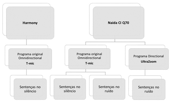 Condições de teste: Para avaliar a contribuição da atualização do processador em situação reverberante isolada, o reconhecimento de sentenças foi medido no silêncio, tanto no mapa em uso no Harmony, como com o Naíida CI Q70 com T-Mic (Figura 1). Para avaliar a contribuição do UltraZoom (UZ), o reconhecimento de sentenças no ruído foi testado com o Naída CI Q 70, com T-Mic e com UZ no mesmo mapa. Todas as condições foram avaliadas em uma única sessão, em apresentação randomizada, embora não cega, pois os processadores e programas foram alterados manualmente.
