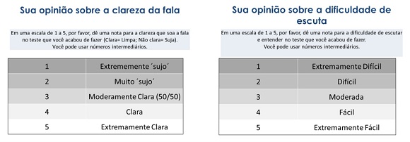 Após cada condição de teste, os participantes avaliaram a clareza do som e a dificuldade de escuta nas diversas condições de teste (Figura 2). Estes julgamentos foram feitos na sala de teste, após a conclusão de cada lista de frases.