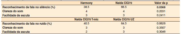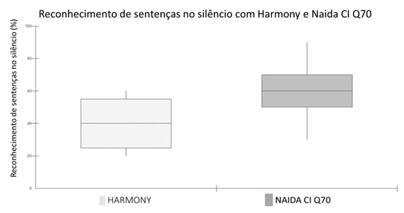 A comparação do reconhecimento de sentenças Harmony e Naída CI Q70 foi realizada por meio de medidas analíticas descritivas e teste de Mann-Whitney, considerando significância quando p <0,05.