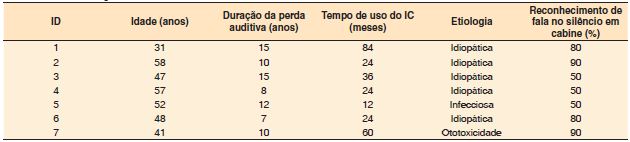 Este estudo prospectivo foi aprovado pelo Comitê de Ética do Hospital das Clínicas da Faculdade de Medicina da Universidade de São Paulo, sob o número de protocolo 1.053.402 (CAAE 43321515.6.0000.0068). O Termo de Consentimento Livre e Esclarecido foi assinado por todos os sujeitos, antes da realização de quaisquer testes ou procedimentos específicos do estudo. Participaram do estudo sete adultos com implante coclear, com surdez bilateral severa a profunda pós-lingual, implantados com o dispositivo Advanced Bionics HiRes 90K, com pelo menos seis meses de experiência e reconhecimento de sentenças em apresentação aberta superior a 50%, no silêncio (medido em cabine acústica).