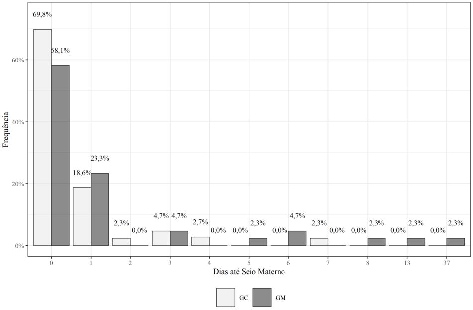 Na Figura 1, é apresentada a prevalência do início da amamentação, conforme os dias (do nascimento ao 37º dia de vida). Observou-se que 58% dos RNs do GM e 70% dos RNs do GC foram levados ao SM logo ao nascimento. Entretanto, 14% do GM começou a mamar somente após 5 dias de vida, especificamente com 5, 6, 7, 8, 13 e 37 dias após o nascimento, enquanto nenhum RN do GC iniciou o SM tão tardiamente (Figura 1).