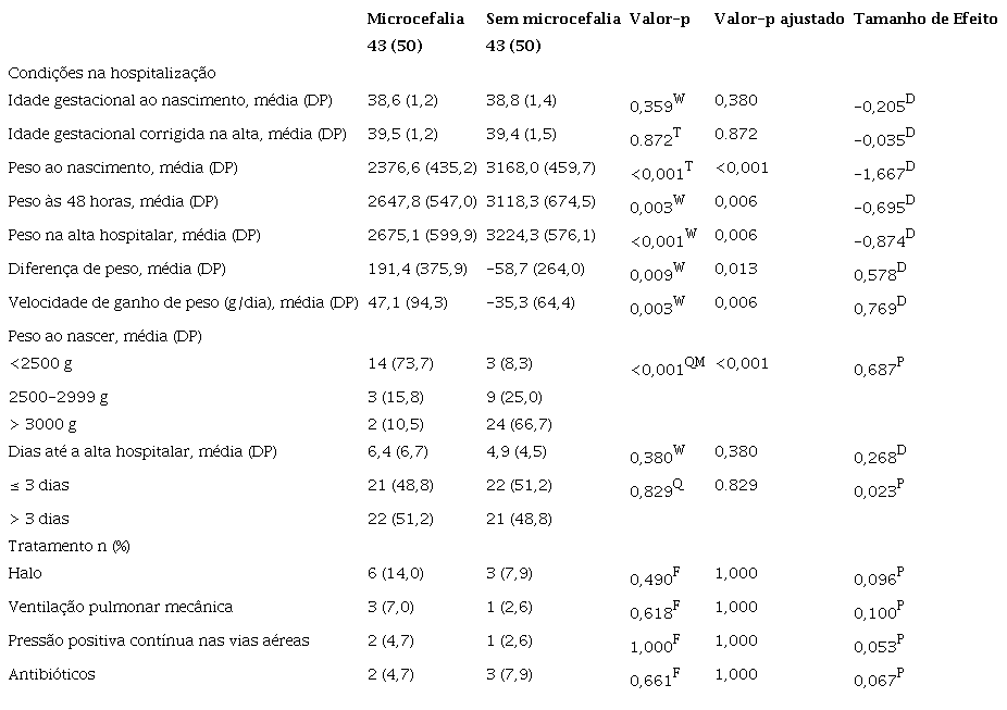 Foi utilizado o Tamanho de Efeito D de Cohen para quantificar as diferenças de medida de tendência central(20). As regressões lineares foram utilizadas para estimar as diferenças de velocidade de ganho de peso (gramas/dia) entre RNs com e sem microcefalia, ajustadas pelo número de dias, até a alta, e métodos de alimentação. Os valores de p foram ajustados pelo método de Benjamini-Hochber(21). Os valores de p <0,05 foram considerados estatisticamente significativos.