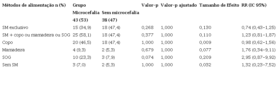 A Tabela 2 apresenta os métodos de alimentação utilizados durante a internação, incluindo SM exclusivo, ou não (complemento por meio de copo, mamadeira ou SOG), e ausência do SM, comparando RNs com e sem microcefalia. Não houve diferenças entre os grupos quanto à oferta de SM, uso de sonda nasogástrica/orogástrica, mamadeiras ou copo. Houve apenas uma tendência maior ao uso de SOG no GM, contudo não significativa (Tabela 2).