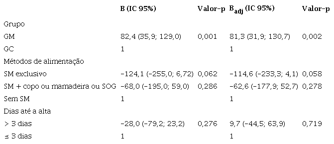 A Tabela 3 apresenta os parâmetros de regressão ajustados para velocidade de ganho de peso, comparando RNs com e sem microcefalia. Quanto aos métodos de alimentação e tempo de internação (dias até a alta), houve diferença entre velocidade de ganho de peso neonatal e presença da microcefalia, com velocidade média de ganho de peso de 81,3 g/dia, sendo maior nos RNs do GM, quando comparados aos do GC (p = 0,002), após ajuste dos valores de p pelo método de Benjamini-Hochber(21) (Tabela 3).