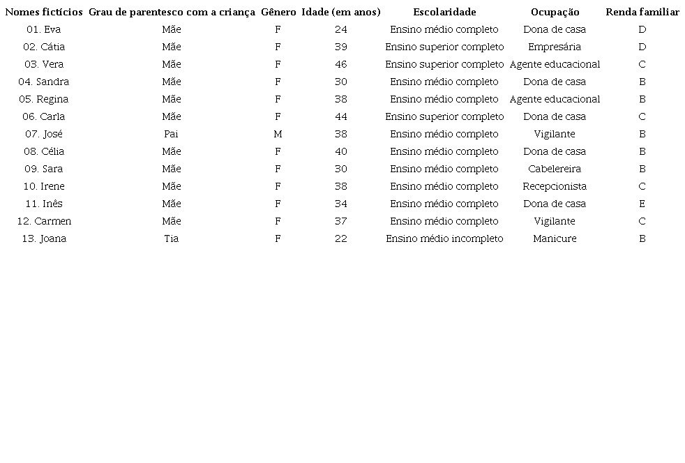 O Quadro 1 apresenta dados referentes aos entrevistados, de acordo com o grau de parentesco com a criança, gênero, idade, escolaridade, ocupação e renda familiar.