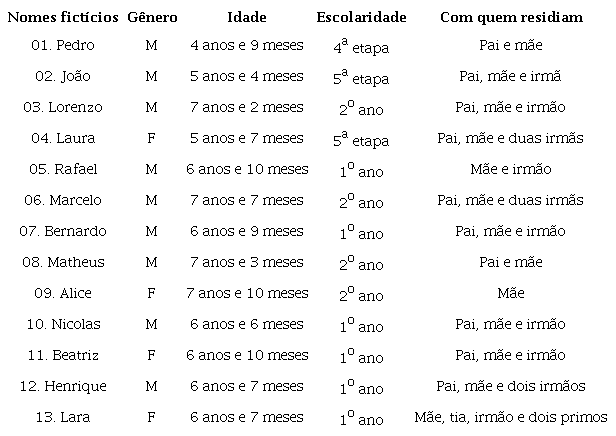 Os sujeitos da pesquisa residiam com as crianças com diagnóstico de TF. Das crianças em tratamento, 9 eram do gênero masculino e 4 eram do gênero feminino. Todas recebiam intervenção fonoaudiológica semanalmente e estavam em processo de escolarização adequado para a idade.