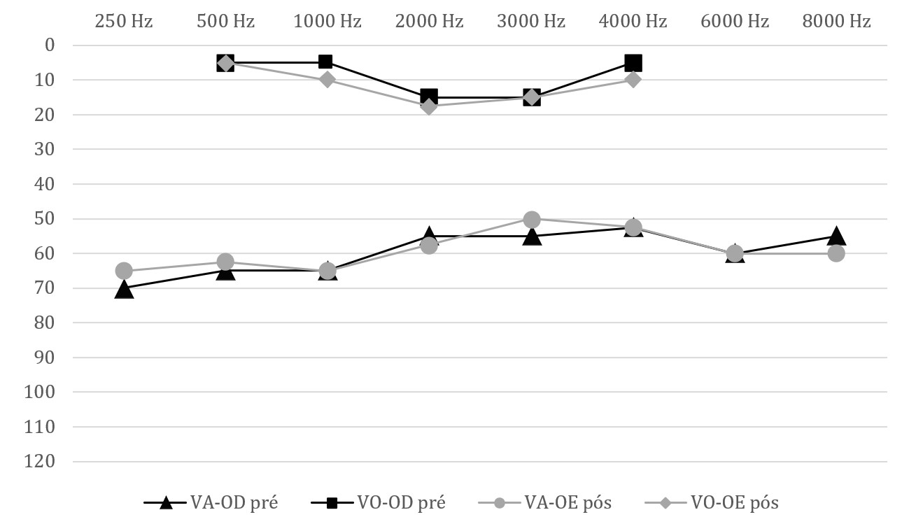 O procedimento cirúrgico não é considerado complexo pelo profissional especialista, pois as estruturas da orelha não são manipuladas durante a intervenção. Assim, não é esperada modificação nos limiares obtidos na audiometria tonal por conduções aérea e óssea após a cirurgia, como foi observado no presente estudo (Figura 1) e condizente com o descrito anteriomente(12).