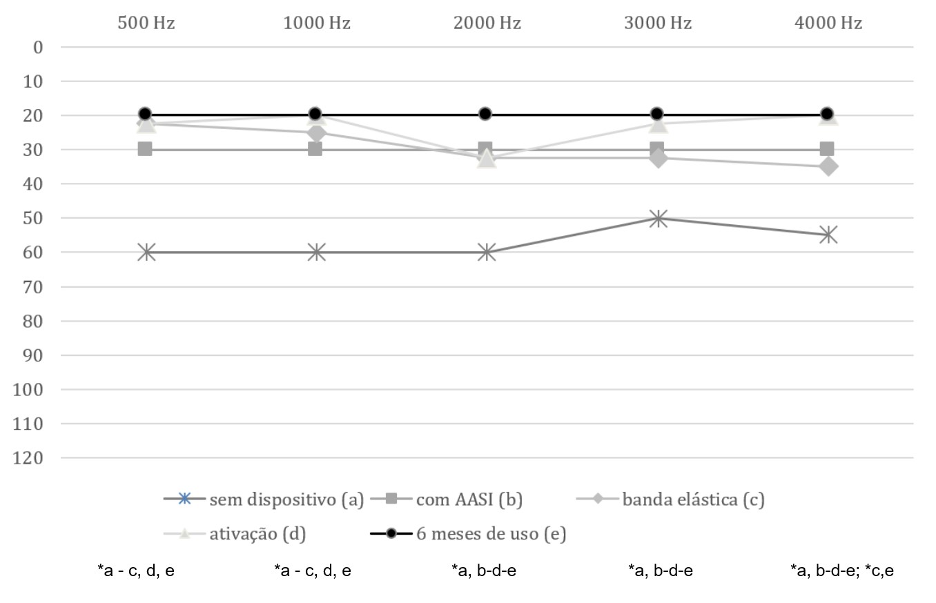 Em relação aos limiares tonais da audiometria em campo livre nas três condições pré-cirúrgicas (sem dispositivo eletrônico; com AASI por condução aérea ou óssea e com o processador Ponto Pro® acoplado a uma banda elástica) e as duas condições pós-cirúrgicas (ativação da PAAO Sistema Ponto® e 6 meses após a ativação), foi possível constatar melhora significativa dos limiares, ao comparar aqueles encontrados na audiometria em campo livre sem uso do dispositivo eletrônico com as demais condições de avaliação, exceto para a condição do indivíduo com AASI, na qual a diferença ocorreu apenas para as frequências de 2, 3 e 4 kHz. Não houve diferença significativa entre os limiares obtidos com o indivíduo utilizando o Sistema Ponto Pro® acoplado a uma banda elástica (momento pré-cirúrgico) e nos momentos pós-cirúrgicos (Figura 2).
