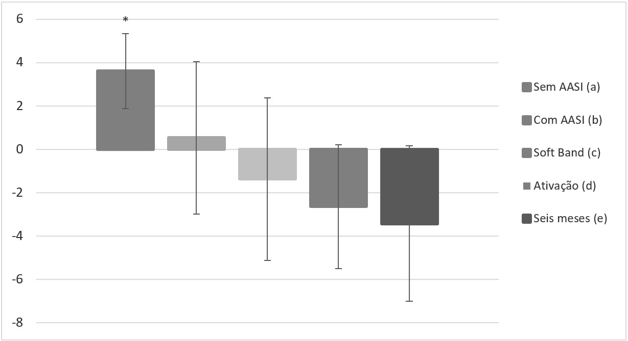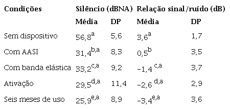 Nos dados referentes ao desempenho no reconhecimento de sentenças no ruído, também comparados entre todas as condições pré e pós-cirúrgicas já descritas, encontrou-se diferença entre a condição sem dispositivo eletrônico, quando comparada às condições com o processador Ponto Pro® acoplado a uma banda elástica, na ativação e 6 meses após a ativação, mas não com o indivíduo usando o AASI. Não foram observadas diferenças entre as demais condições de teste (Figura 3).
