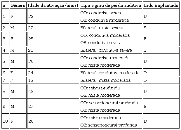 Diante dos critérios previamente estabelecidos, foram analisados os prontuários de 10 indivíduos, sendo 5 do gênero masculino e 5 do gênero feminino, com média de idade de 27 anos, mínima de 15 anos e máxima de 49 anos, adaptados unilateralmente com o Sistema Ponto Pro®. Desses indivíduos, 6 eram portadores de malformação de orelha bilateral e 4 apresentavam sequelas de otite média crônica bilateral e utilizavam AASI por condução aérea ou óssea, anterior à cirurgia. A caracterização da casuística está apresentada no Quadro 1.