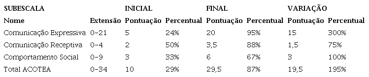 O item do ACOTEA que apresentou maior variação entre a avaliação inicial e final foi a comunicação expressiva, que evoluiu de 5 para 20 pontos, representando 300% de variação (Tabela 3). A comunicação receptiva variou 75% e o comportamento social, 100%.