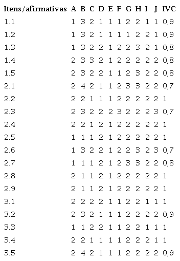 A Tabela 1 apresenta os resultados emitidos pelos especialistas e o IVC de cada uma das afirmativas do instrumento, para registro da análise do protocolo. O instrumento apresentou escore médio de concordância entre os juízes de 0,889, que indica concordância aceitável.