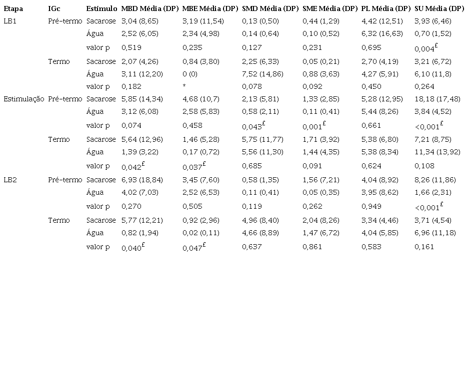 Quanto aos estados comportamentais, na etapa estimulação, nos RNT do grupo sacarose observou-se diminuição de percentual de tempo no estado de sono e aumento no estado de alerta, concordando com estudos que abordam a sacarose como eliciadora de estados de maior atenção(1,18,22). Já os RNPT, quando estimulados com água, apresentaram menor percentual de tempo de agitação, em relação à LB1, não havendo correlação significativa com sacarose, evidenciando que nos prematuros aqui estudados a estimulação oral surtiu efeito, independente do estímulo utilizado, tal como demonstrado em pesquisas anteriores(1,22).