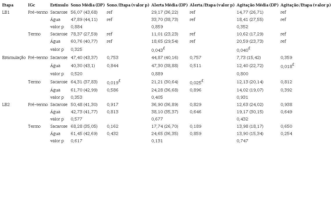 Quanto à comparação entre etapas, foi observado aumento no percentual de tempo de alerta (+10%) e diminuição do tempo de sono (-14%) nos RNT estimulados com sacarose durante a etapa estimulação, em relação à LB1. Além disso, houve diminuição do percentual de tempo de agitação (-6%) entre os RNPT estimulados com água, na etapa LB1 para estimulação.