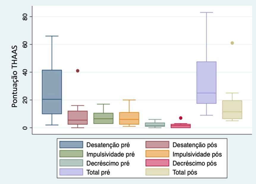 A Figura 1 mostra a representação gráfica dos dados do desempenho do THAAS quanto à mediana, à amplitude, à simetria ou assimetria dos dados. Verificou-se que o desempenho de todos os indivíduos melhorou na avaliação com o uso da medicação e que a mediana apresentou menor variação entre os indivíduos testados após a medicação, exceto em relação ao item impulsividade.