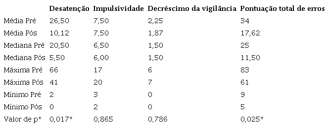 Com relação à análise dos tipos de erro do THASS, pôde-se observar que houve diferença no quesito desatenção (p=0,017) e pontuação total de erros pré e pós-medicação (p=0,025) (Tabela 2).