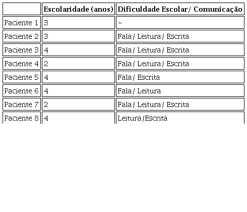 Fizeram parte deste estudo 8 crianças do gênero masculino, sendo 3 com 8 anos, 4 com 9 anos e uma com 10 anos de idade. Quanto à escolaridade, metade (50,0%) estava no 4º ano do ensino fundamental. Todos faziam uso da medicação psicoestimulante, sendo que 7 (87,5%) utilizavam o metilfenidato e um (12,5%), lisdexanfetamina. O tempo de uso da medicação variou de 1 a 12 meses (média de tempo de 7,28 meses), com a dose diária variando de 1 a 3 comprimidos. Observou-se que a maior parte das crianças apresentava distúrbios da comunicação humana (Quadro 1).
