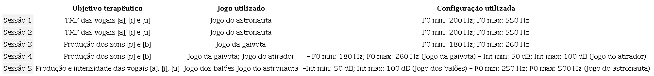 A terapêutica com os jogos digitais focou no desenvolvimento do tempo de fonação das vogais [a], [i], [u]; aperfeiçoamento da articulação dos sons oclusivos [p], [b]; desenvolvimento da coordenação fina de respiração e articulação necessárias à fala. Aplicou-se o jogo digital intitulado VoxTraining, formado por um conjunto de onze jogos de exercícios vocais, com o objetivo de estimular, condicionar e treinar os aspectos de voz e fala, aprimorando a produção e controle de diversos parâmetros vocais **, tais como: a) intensidade vocal: o controle da intensidade foi trabalhado na dimensão forte-fraco e dois jogos foram utilizados: o jogo do avião e o dos balões; b) frequência vocal: o controle da frequência foi trabalhado na dimensão grave-agudo com o jogo da gaivota; c) ritmo e ataque vocal: para o trabalho simultâneo de ritmo e ataque vocal foi utilizado o jogo do atirador; d) tempo máximo de fonação: trabalhou-se com o jogo do astronauta para aumento do TMF.