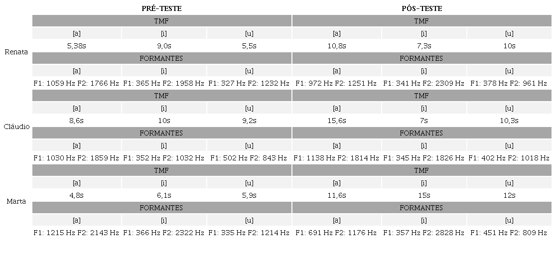 Em relação ao TMF nas vogais – com exceção da vogal [i] nos participantes Renata e Cláudio – observou-se aumento entre o pré-teste e pós-teste, o que permitiu afirmar que houve manutenção dos novos valores no decorrer do processo terapêutico. Para tal, pode-se sugerir que o procedimento foi eficaz.