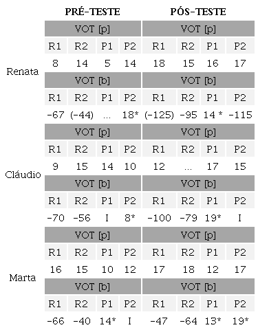Considerando tais valores para indivíduos com surdez, analisaram-se, na presente pesquisa, valores similares para [p], que variaram entre 8ms e 16ms no pré-teste; para valores de [p] no pós-teste, houve variação entre 12ms e 19ms, valores estes que demonstraram evolução e que se encontram dentro da normalidade. Em relação aos valores de [b] no pré-teste, observou-se que houve trocas de [b] por [p], porém, nos momentos de produção de [b], houve variação dos valores entre -40ms e -70ms; para valores de [b] no pós-teste, houve variação de -47ms a -125ms.