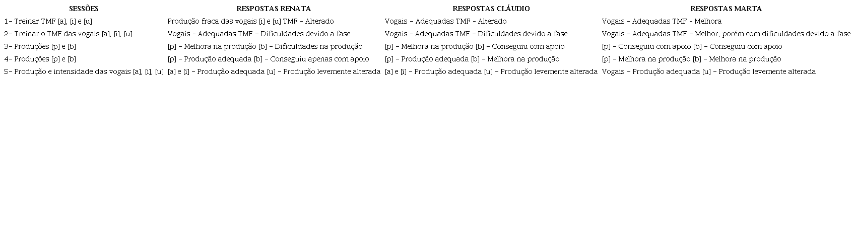Para execução desta etapa, utilizou-se: a) tarefas de repetição de palavras: uso do índice de reconhecimento de palavras dissílabas, foneticamente balanceadas; b) emissão isolada de cada som: emissão das vogais [a], [i] e [u] e sons oclusivos [p] e [b]. Era requisitado que o participante emitisse, no mínimo, duas vezes os sons solicitados pela terapeuta. Sempre que necessário eram fornecidas pistas sinestésicas para a produção mais próxima do som; c) realização do Tempo Máximo de Fonação (TMF) : sustentar as vogais [a], [i] e [u] o maior tempo possível. A análise do TMF seguiu critério proposto por estudo anterior (5), sendo esperado que, para as crianças deste estudo, variasse entre seis e sete segundos.