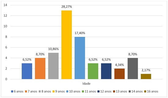 Quanto à idade, verificou-se maior concentração de escolares com 9 e 10 anos de idade, respectivamente ( Figura 1).