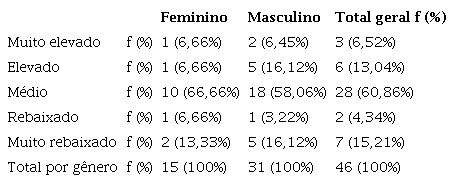 Na análise descritiva dos dados demográficos contidos na anamnese, verificou-se que, da amostra total, 16 (32,60%) eram do gênero feminino e 31 (67,40%) do masculino.