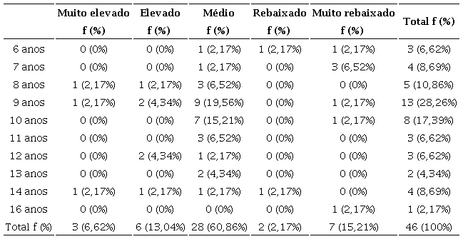 Vocabulário receptivo: foi utilizado o Teste de Vocabulário por Figuras – USP- TVfusp (17), em sua versão extensa (TVfusp139o), com o objetivo de avaliar o desenvolvimento do vocabulário auditivo (compreensão de palavras). Composto por 139 estímulos, cada estímulo contém quatro figuras para escolha. A criança deve escolher a figura que corresponde à palavra pronunciada pelo avaliador. Foi considerada a pontuação total e suas classificações de cada ano de escolaridade, respectivamente. Nesse teste, de acordo com a quantidade de acertos, classifica-se o vocabulário receptivo em “muito rebaixado”, “rebaixado”, “médio”, “elevado” e “muito elevado”. Para o critério de classificação apresentar-se na média, o escore de acertos por escolaridade é de 105,8 para o 2º ano, 112,8 para o 3º ano e 117,4 para o 4º ano. Considerando que as crianças e adolescentes que chegam ao Laboratório LEIA apresentam dificuldades de aprendizagem e não há um teste brasileiro em vocabulário receptivo para a escolaridade a partir do 5º ano, considerou-se a pontuação máxima do teste, ou seja, a do 4º ano, para os escolares acima desta escolaridade. Este processo de análise da pontuação foi realizado previamente à pesquisa. Assim, nos resultados desta pesquisa encontra-se a classificação utilizada pelo teste (muito rebaixado, rebaixado, médio, elevado e muito elevado).