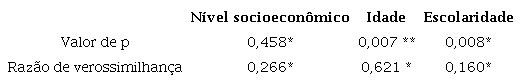 Na análise inferencial, realizada por meio do teste do Coeficiente de Correlação de Spearman, entre idade e vocabulário receptivo houve correlação estatisticamente significativa (p=0,007), mas de magnitude fraca (cc=0,395). Quanto à relação entre vocabulário e escolaridade, por meio do teste Qui-quadrado de Pearson, houve correlação (p=0,008), o que significa que, quanto maior a escolaridade, melhor o desempenho em vocabulário receptivo. No tocante à relação entre o vocabulário receptivo e o nível socioeconômico, por meio do teste Qui-quadrado de Pearson, não houve associação entre ambos (p=0,458) ( Quadro 5).