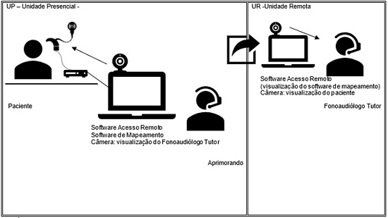 A teleconsulta foi realizada em dois locais diferentes: Unidade Presencial (UP), local onde estavam o aprimorando e o paciente, e Unidade Remota (UR), local onde estava o fonoaudiólogo tutor para dar a assistência a distância no mapeamento do implante coclear de forma síncrona ( Figura 1).