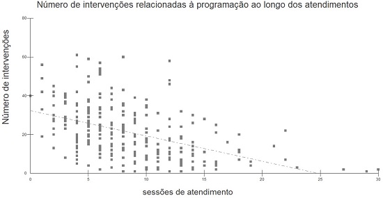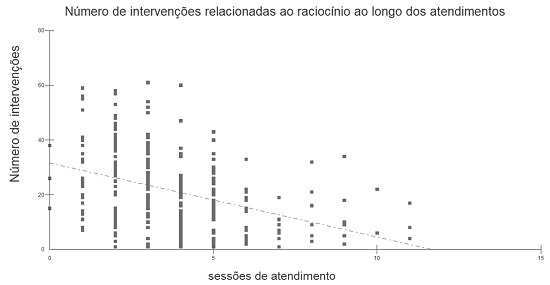 A análise estatística das intervenções, considerando todos os aprimorandos e analisando individualmente, mostrou que houve uma correlação estatística com diminuição do número de intervenções totais, nas intervenções do mapeamento do processador de fala ( Figura 2), e raciocínio clínico ao longo das sessões ( Figura 3). O teste ANOVA analisou a diminuição das intervenções entre os aprimorandos e mostrou que não houve diferença, considerando que cada participante apresentou um número de horas de supervisão diferente.