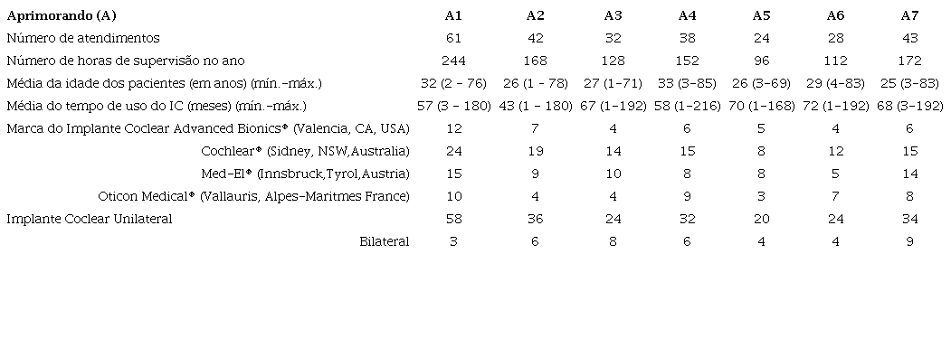Além disso, a possibilidade de atender desde crianças até idosos, como também a grande variação no tempo de uso do implante coclear, enriqueceu o ensino dos aprimorandos para o raciocínio clínico e a escolha do protocolo de avaliação para cada idade e experiência auditiva. Apesar de o número de atendimentos ser diferente entre os aprimorando s, devido ao fato de o calendário do hospital e o cronograma do curso serem alterados anualmente em razão do número de alunos, não houve diferença na caracterização dos pacientes e nem nas intervenções realizadas.