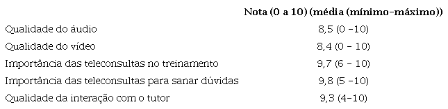 O questionário que abordou a qualidade da teleconsulta foi o mesmo utilizado na dissertação de Paiva (3) (Material Suplementar Apêndice 2). Continha cinco questões com uma escala que variava de 0 a 10 (péssimo a excelente) e que se referiam à qualidade do áudio e vídeo e ao aprendizado no dia de forma geral, na visão do aprimorando. Continha, também, uma questão dissertativa sobre comentários gerais da teleconsulta.