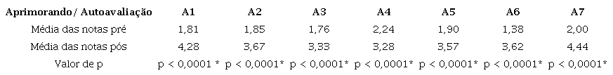 Os dados foram analisados qualitativamente e incluindo a análise da correlação por Spearman entre os tempos de atendimento ao longo do ano e o número total de intervenções realizadas. Aplicou-se o teste ANOVA para comparação entre os aprimorandos. O teste t pareado foi realizado para comparar a autoavaliação entre os sujeitos. Foi considerada significância quando valor de p> 0,05.